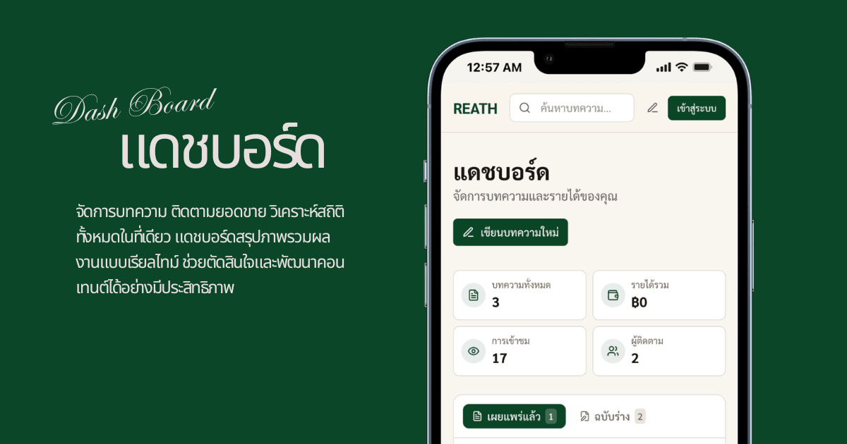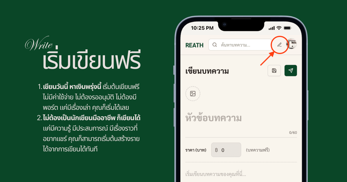 Reath คือแพลตฟอร์มบทความที่ออกแบบมาสำหรับใครที่อยากแชร์ ไม่ต้องเป็นนักเขียนมืออาชีพก็เขียนได้ แค่มีเรื่องราว ความรู้ หรือประสบการณ์เจ๋ง ๆ ที่ควรค่าแก่การเล่า แม้กระทั่งจะเขียน blog ก็ทำได้เช่นกัน